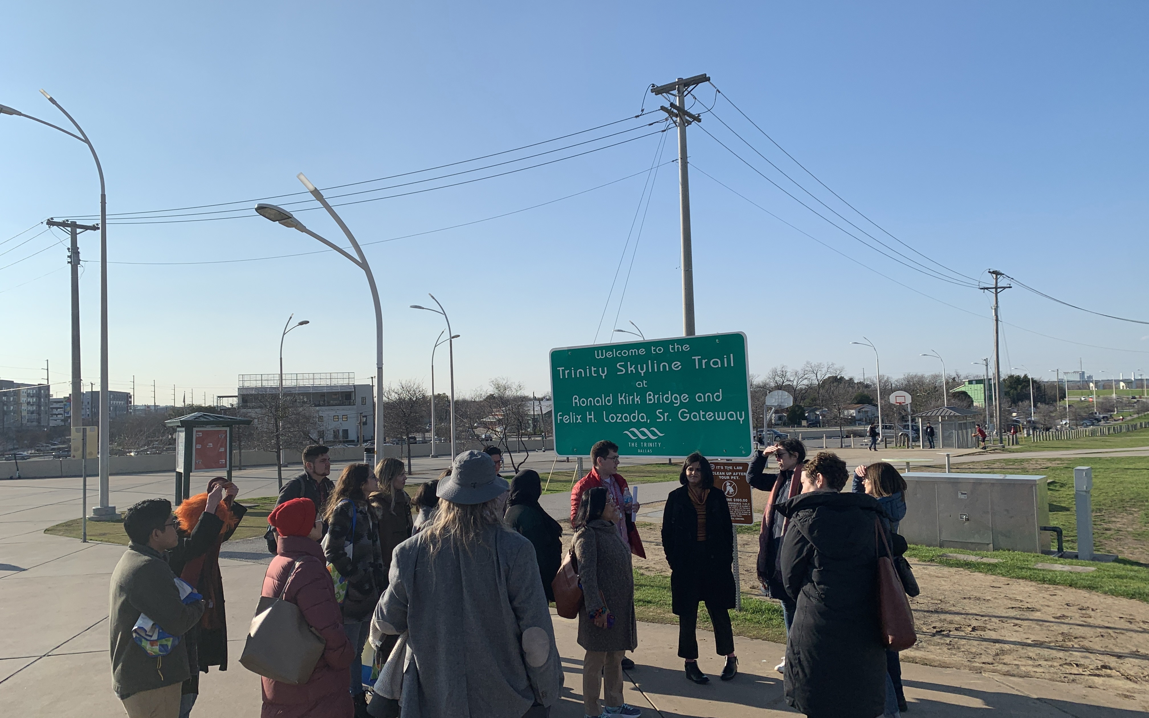 Platforms to the World also considered the borders that emerge in a swiftly evolving urban landscape. On the second day, we visited the Trinity River, which unofficially defines the western border of Dallas, to consider how urban infrastructures perpetuate social divisions. In preparation, three graduate students at ATEC, Catalina Alzate, Angelica Martinez Ochoa, and Cansu Simsek, led a workshop on the history of the river and the city and encouraged us to reflect on our own movement practices and spatial relationships to the urban environment’s (official and unofficial) borders.