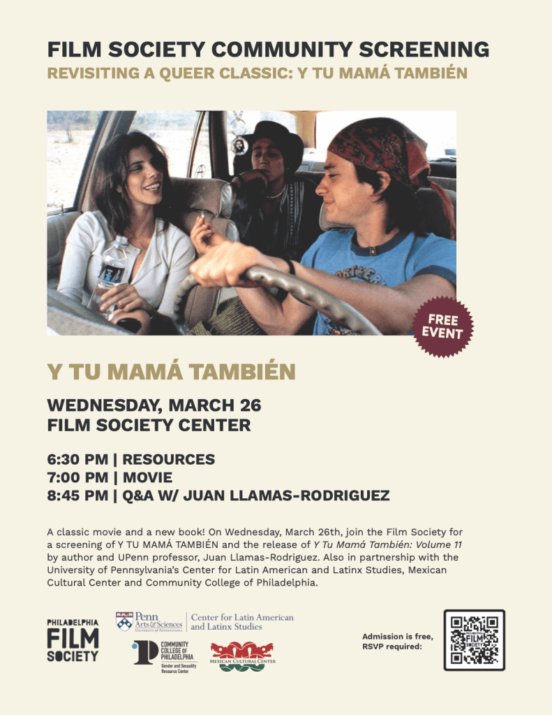 Flyer from the March 26, 2024, book launch and community screening with the Philadelphia Film Society, the Mexican Cultural Center, and the Community College of Philadelphia: